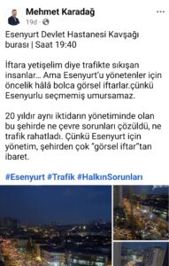 20 yıldır aynı iktidarın yönetiminde olan bu şehirde ne çevre sorunları çözüldü, ne trafik rahatladı. Çünkü Esenyurt için yönetim, şehirden çok “görsel iftar”tan ibaret.