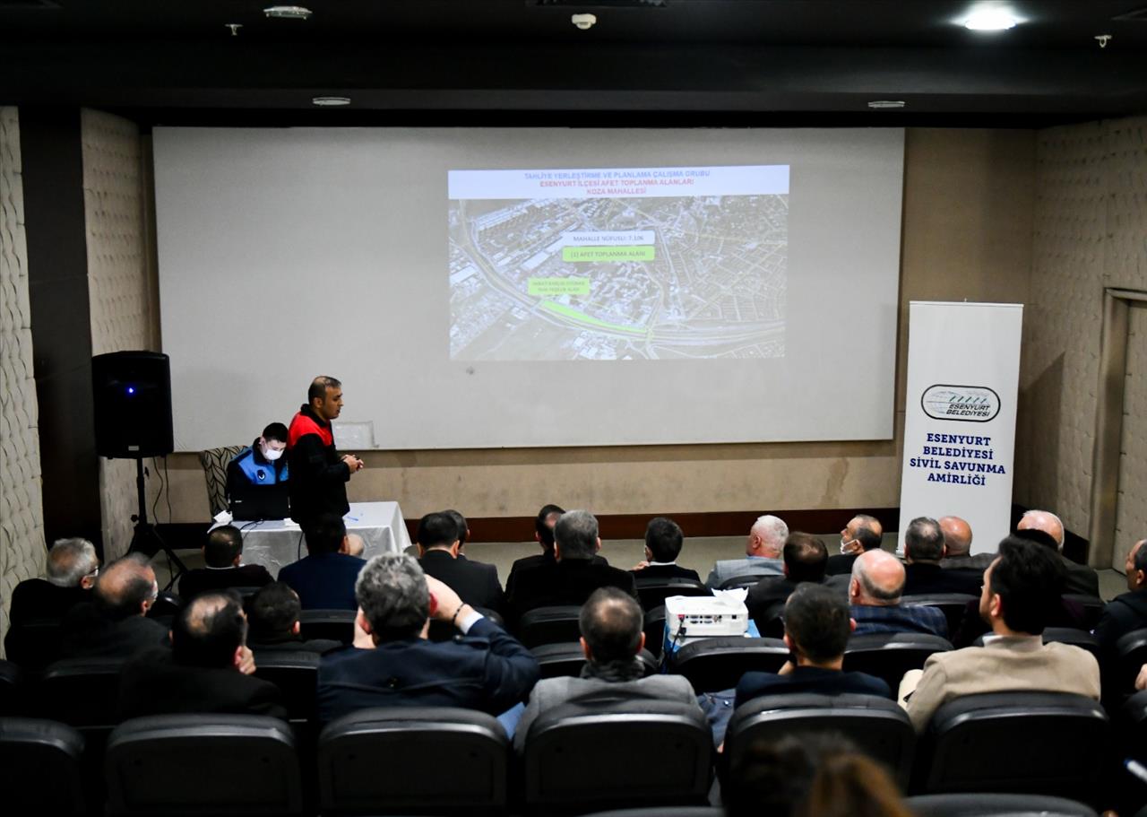 Esenyurt Belediyesi Muhtarlık İşleri Müdürlüğü, ilçedeki muhtarlara yönelik bilgilendirme toplantısı gerçekleştirdi. Esenyurt Kültür Merkezi’nde düzenlenen toplantıya katılan muhtarlara Esenyurt Belediye Başkan Yardımcısı Hayrettin Babahan eşlik etti. Zabıta Müdürlüğüne bağlı Sivil Savunma Amirliği tarafından gerçekleştirilen toplantıda, ilçedeki toplanma alanları hakkında detaylı bir sunum yapıldı. Yapılan sunumda, olası afetler sırasında vatandaşların toplanacağı alanlar, haritalar üzerinden mahalle mahalle anlatıldı.